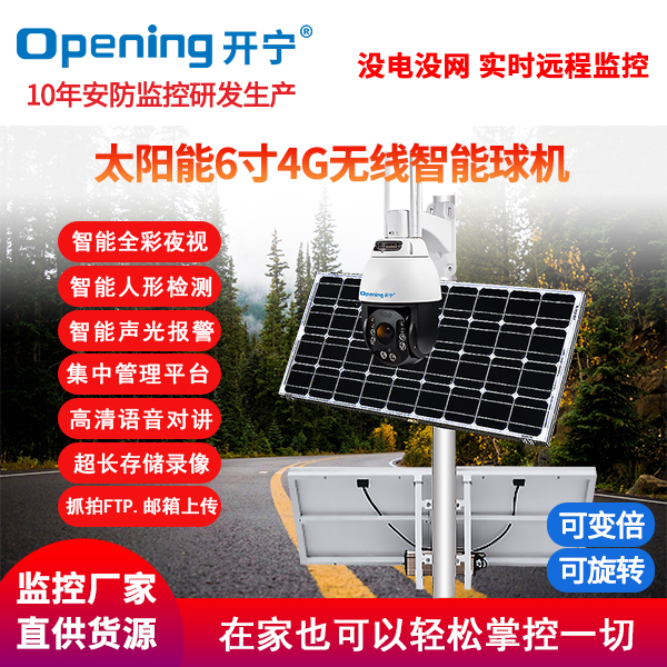 采用开宁6寸4G无线智能变焦球机+开宁太阳能供电系统(含太阳能板和电池,有不同的规格选择)组成太阳能4G监控系统;监控专用高清自动变焦镜头,4g无线小球水平旋转:0°~360°,垂直旋转:0°~90°;7颗高效能点阵红外灯,3颗远距离激光灯,红外夜视距离可达150米;6寸20倍变焦球机,水平360°连续旋转,无监视盲区;支持预置位和巡航;移动侦测报警 Email报警,FTP图片上传,手机推送;高清保真拾音器及高清晰喇叭,可语音对讲;