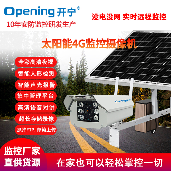 采用开宁4.5寸4G无线智能30倍变焦小球+开宁太阳能供电系统(含太阳能板和电池,有不同的规格选择)组成太阳能4G监控系统;30倍监控专用高清自动变焦镜头,可拉远拉近;水平旋转:0°~360°,垂直旋转:0°~93°;5颗高效能点阵红外灯,6颗高效能点阵白光灯,夜视10-100米;高清保真拾音器及高清晰喇叭,可语音对讲;