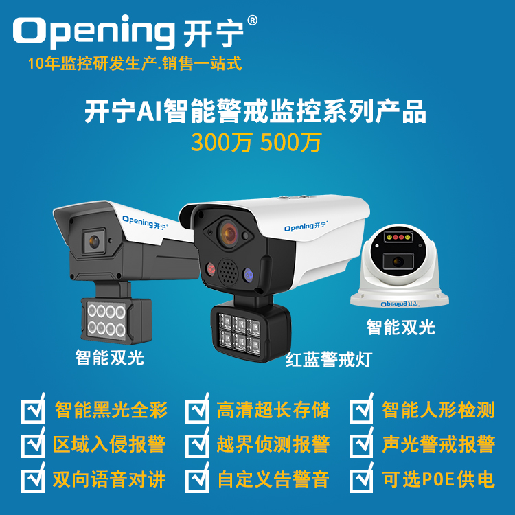 开宁智能AI监控摄像头支持区域入侵和越界识别等智能化识别的类型,只需要在区域提前设定的界线,假如有人进入,设备启用红蓝灯频闪、发出声音警示,及时告诉人们有有危险,要避开。