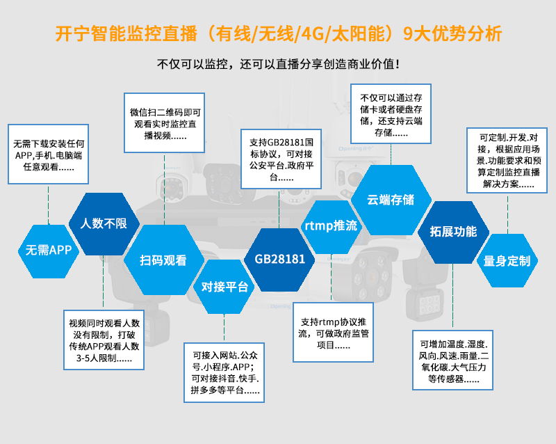 4、可接入网站.公众号.小程序.APP;支持GB28181协议;可接公安.食品.工地.生产.教育.畜牧.旅游等监管部门平台;