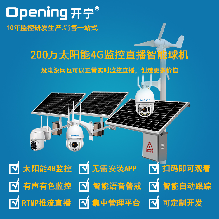 - 1、200万太阳能4G监控直播智能球机,一个球机就是一套监控直播系统;支持360度旋转,支持预置点和巡航,30倍光学变焦,IP66防水等级;