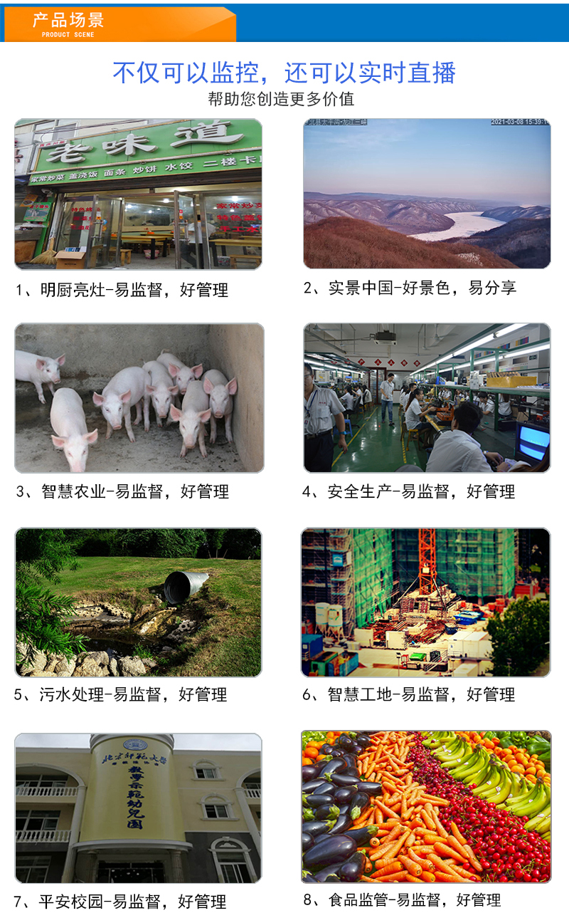 4、可接入网站.公众号.小程序.APP;支持GB28181协议;可接公安.食品.工地.生产.教育.畜牧.旅游等监管部门平台;