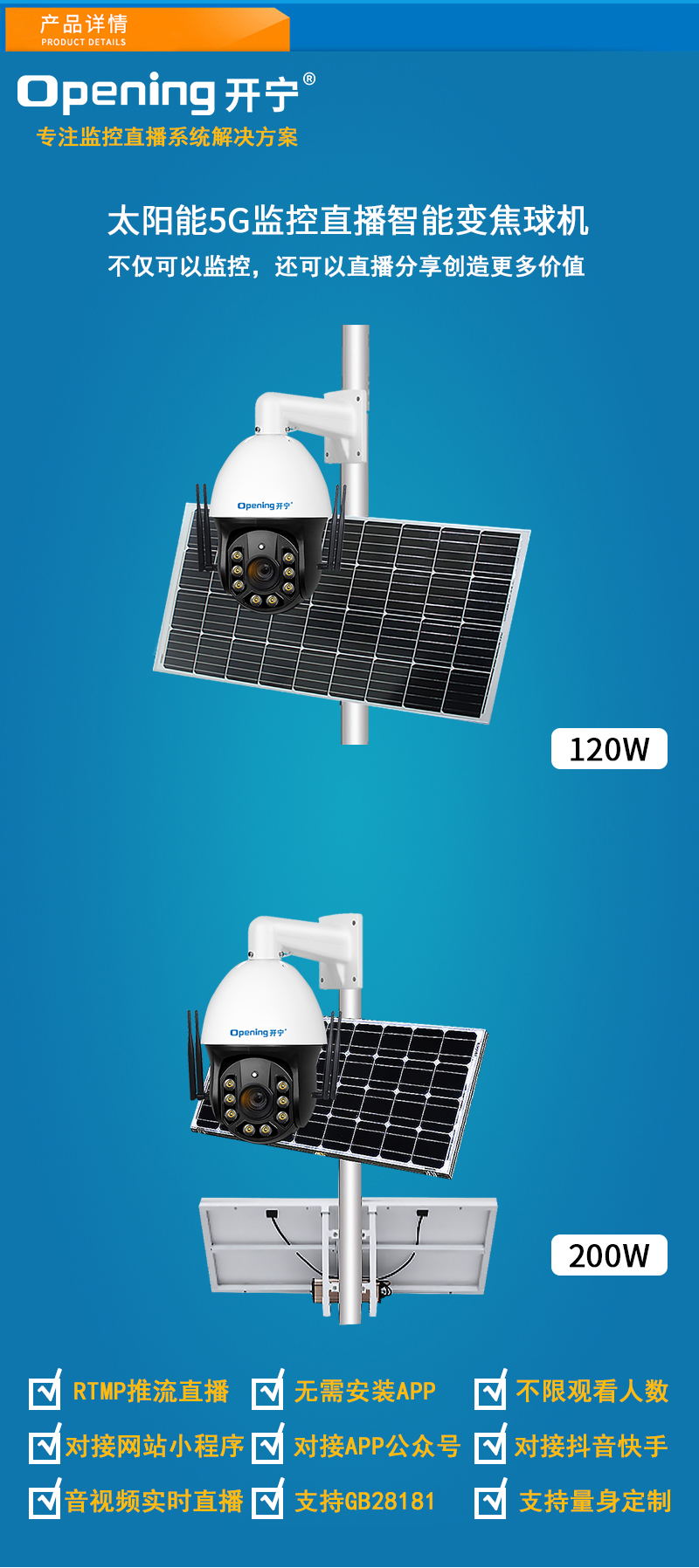 2、内置智能4G模块,没有宽带网络的地方也能实现实时监控直播;另外选配太阳能供电系统可实现无电无网实时监控直播;