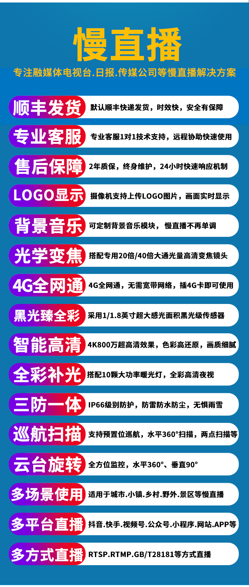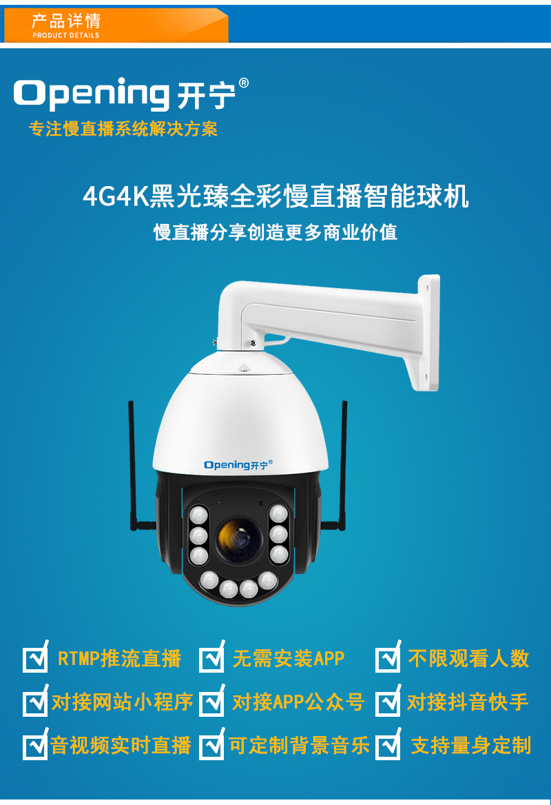 - 1、4K800万6寸4G 20倍黑光臻全彩慢直播智能高清球机,一个球机就是一套慢直播系统;支持360度旋转,支持预置点和巡航,20倍光学变焦,半金属外观,IP66防水等级;