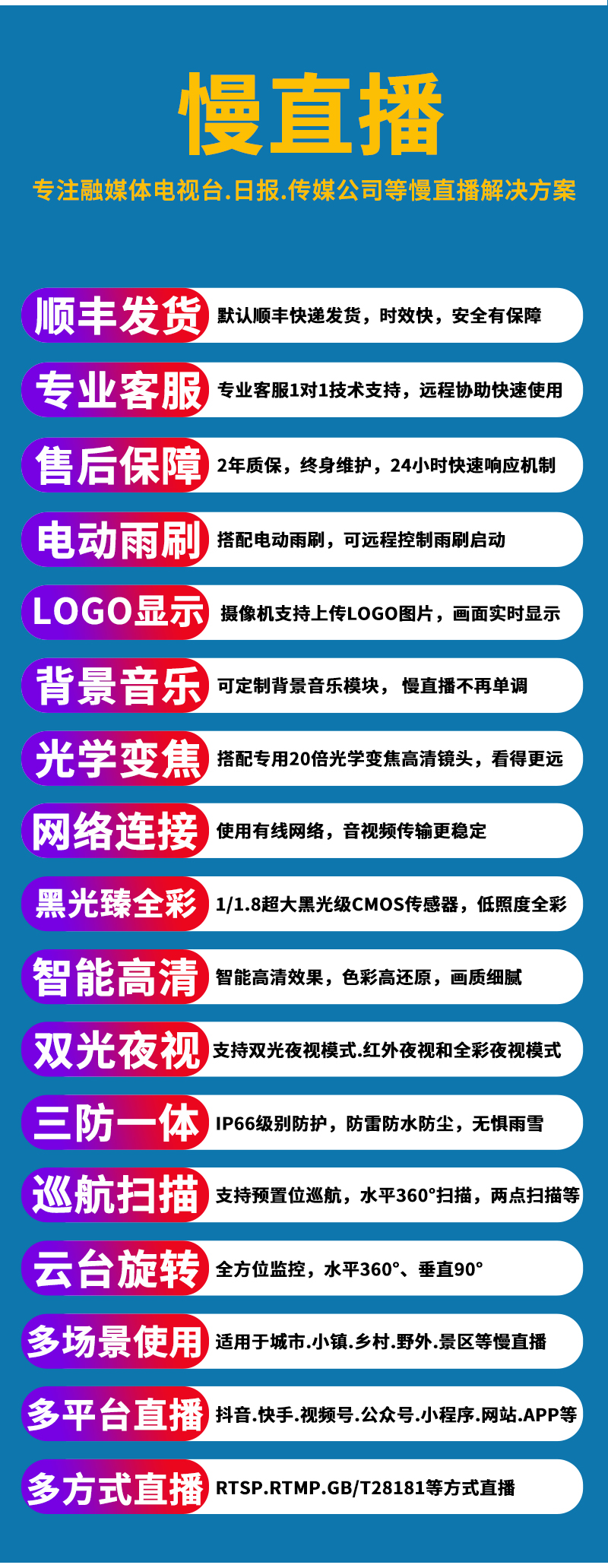 - 1、4K800万6寸20倍双光全彩慢直播智能球机,一个球机就是一套慢直播系统;水平360度无限位旋转,垂直100度旋转;支持256个预置位 8组巡航8组扫描,支持水平扫描,2点区域扫描,随机扫描;20倍光学变焦,2倍数字变倍,金属外观,IP66防水等级;