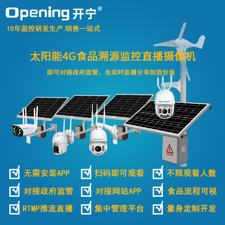 - 1、太阳能4G食品监管监控直播摄像机,一个摄像机就是一套监控直播系统;政府监管食品好帮手;